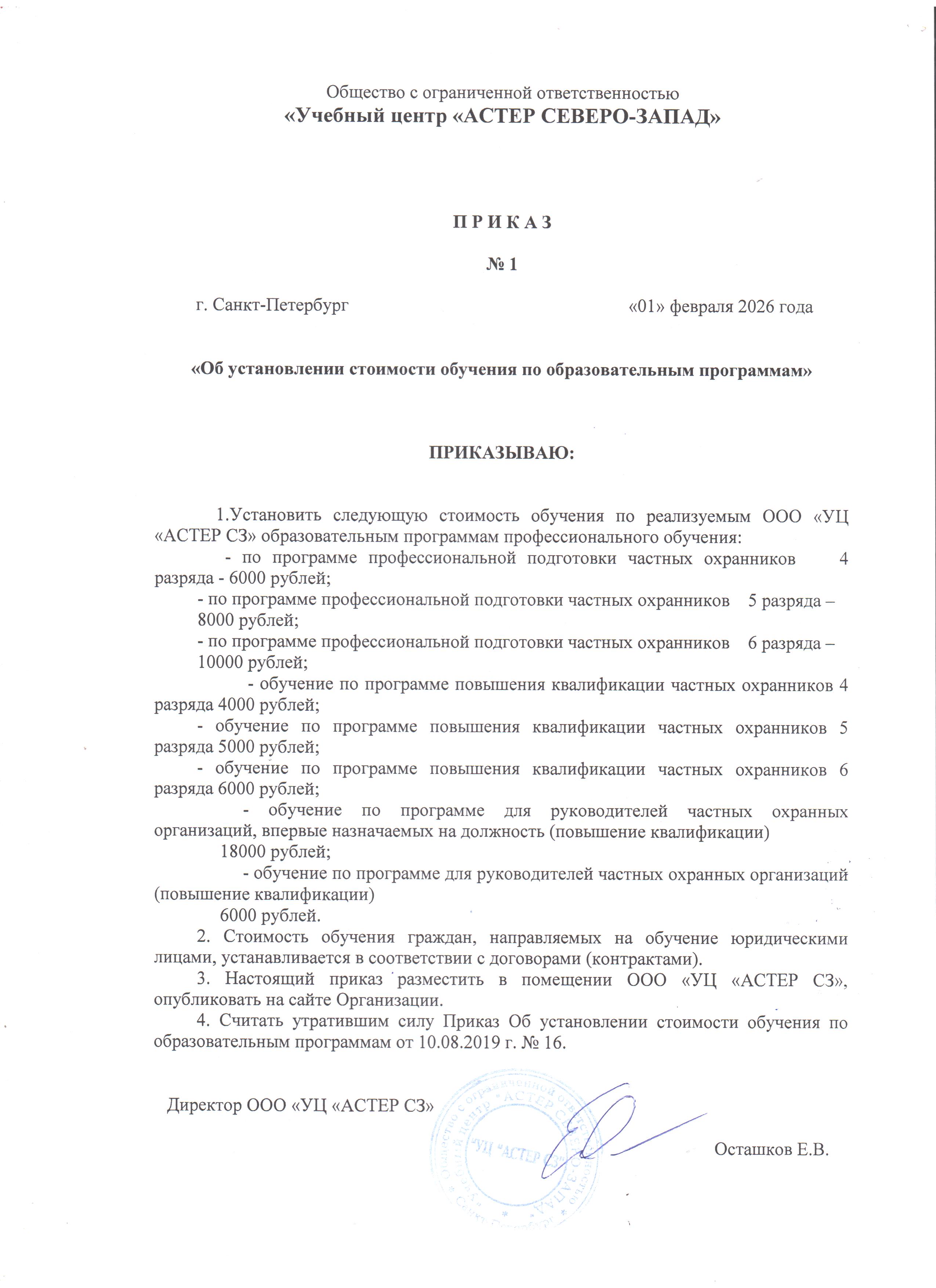 Приказ об утверждении стоимости обучения по каждой образовательной программе